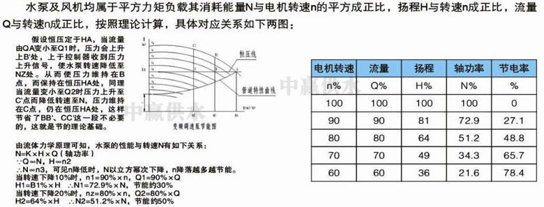 而HBW無負(fù)壓供水設(shè)備與自來水輸水管網(wǎng)直接串接,可以充分利用自來水管網(wǎng)原有的壓力;采用節(jié)能智能變頻控制技術(shù),設(shè)備的電機(jī)泵在微機(jī)控制下,根據(jù)自來水的壓力來調(diào)節(jié)電機(jī)的轉(zhuǎn)速,只對自來水的進(jìn)水壓力和所需壓力的差進(jìn)行補(bǔ)壓,不做無用功,節(jié)能效果顯著,與傳統(tǒng)設(shè)計的采用常規(guī)繼電接觸器控制的給水設(shè)備相比,節(jié)電可達(dá)20%~60%以上。其節(jié)能分析如下: