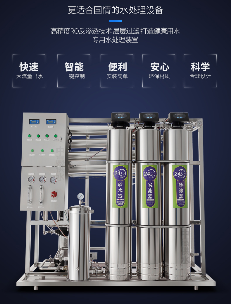 采用多次過濾層的過濾器,主要目的是去除原水中含有的泥沙、鐵銹、膠體物質(zhì)、懸浮物等顆粒在20um以上的物質(zhì),可選用手動(dòng)閥門控制或者全自動(dòng)控制器進(jìn)行反沖洗、正沖洗等一系列操作。保證設(shè)備的產(chǎn)水質(zhì)量,延長(zhǎng)設(shè)備的使用壽命。