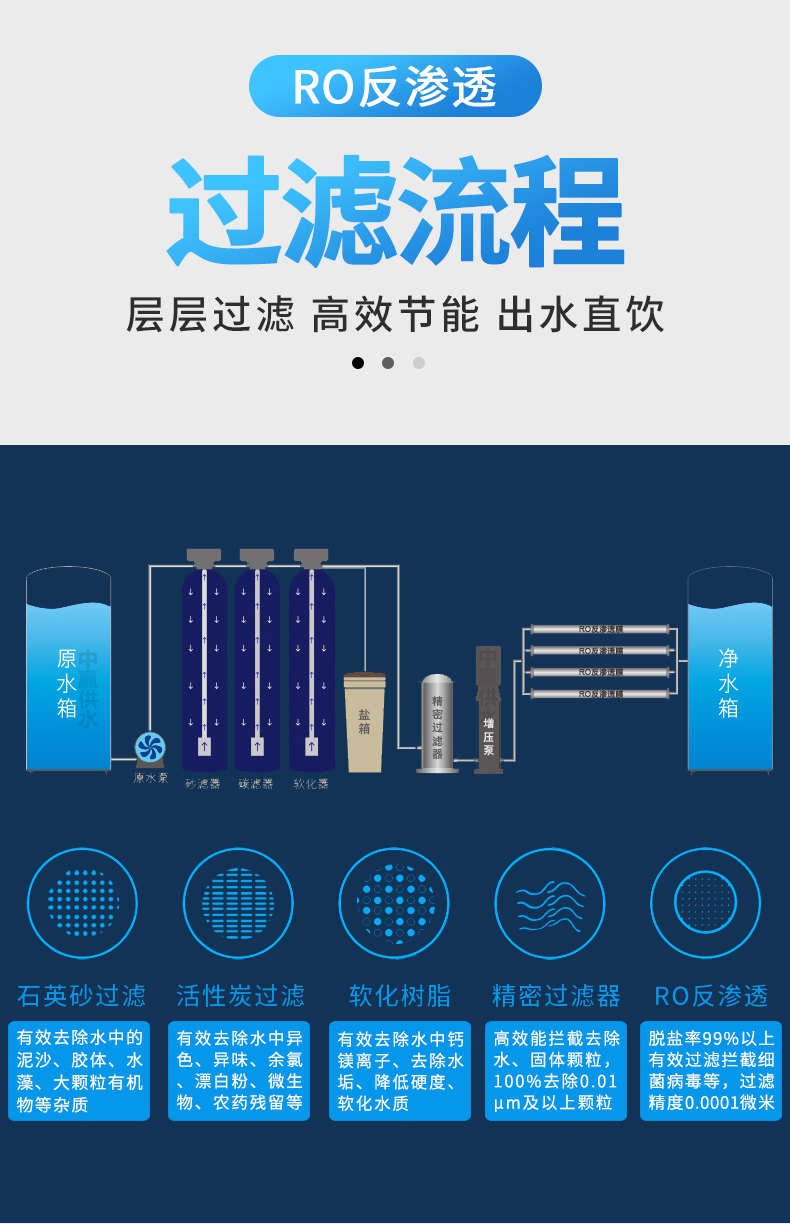 原水 → 原水箱 → 原水泵 →多介質(zhì)過濾器 (石英砂過濾器)→活性炭過濾器 →軟水處理器(添加阻垢劑裝置) → 精密過濾器 → 高壓泵 → 一級(jí)反滲透(RO)裝置 →紫外線殺菌裝置(臭氧殺菌裝置) → 用水點(diǎn)